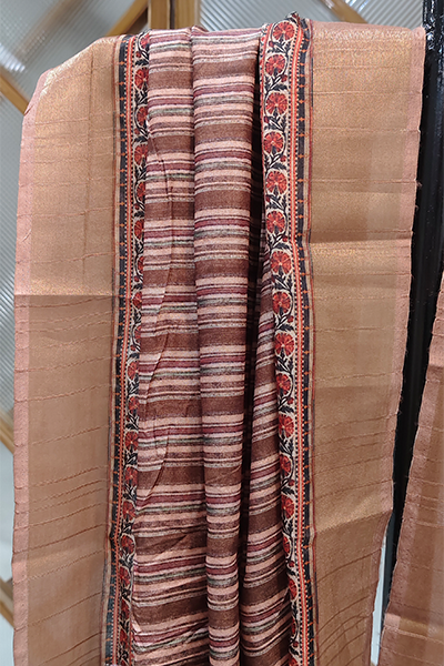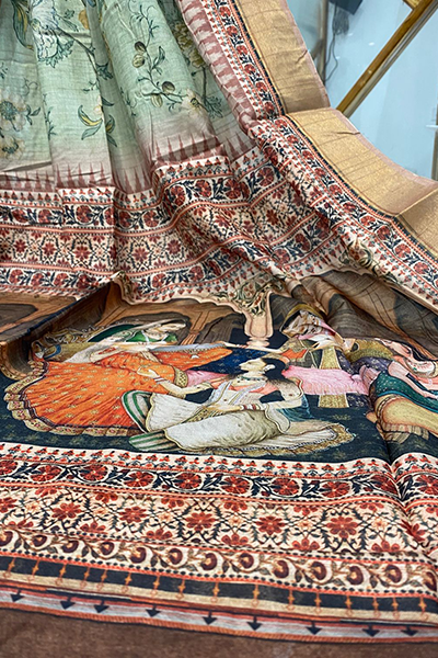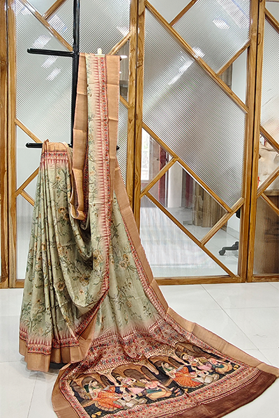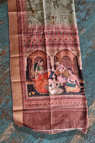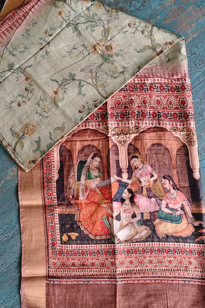 Celebrate the poetry of tradition and timeless grace with this elegant semi silk saree. Draped in soft hues of olive and copper, it features an all-over vintage floral print, while the pallu showcases a regal tableau of classical dancers in a royal durbar—digitally printed with exquisite detail and rich, earthy tones.