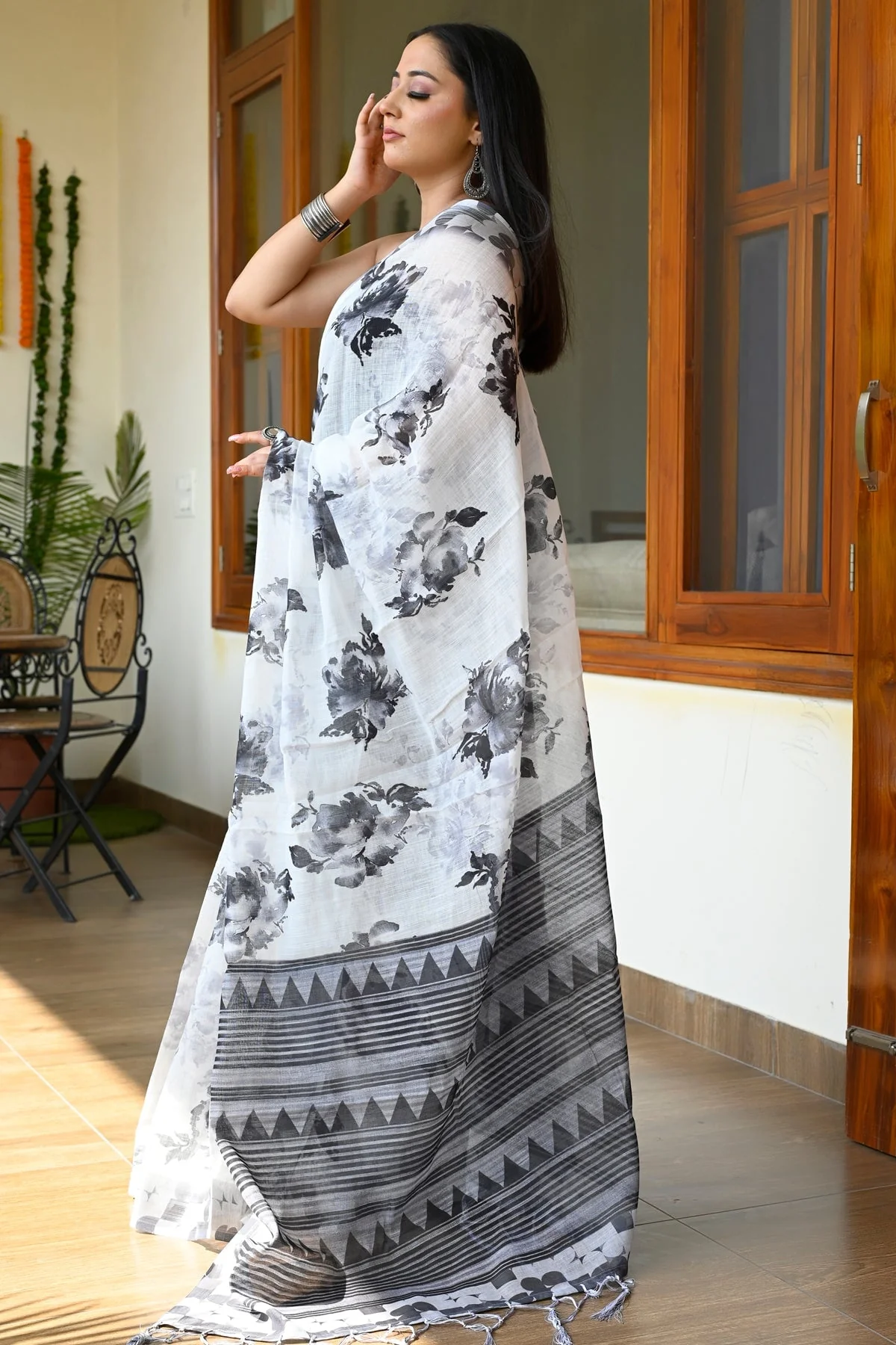 Cream With Black Linen Saree with Digital Floral Print