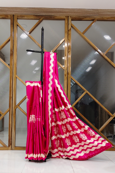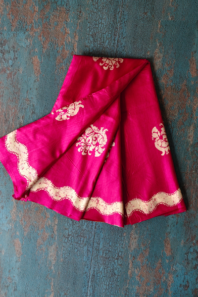 Brimming with timeless charm, this magenta pink silk-blend saree is a radiant blend of color and craftsmanship. The body is adorned with delicate ivory floral motifs placed thoughtfully, giving the fabric a lively yet graceful appeal. What truly captivates is the bold scalloped ivory border and pallu, intricately patterned with traditional floral elements that add dimension and cultural flair. The rich magenta base contrasts beautifully with the detailed ivory work, making it ideal for women who cherish vibrant elegance with a classic touch.