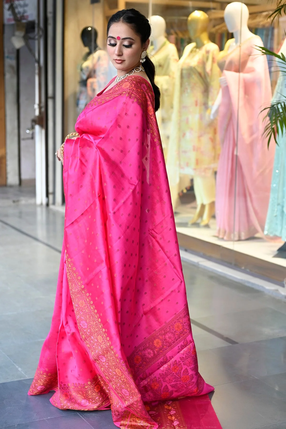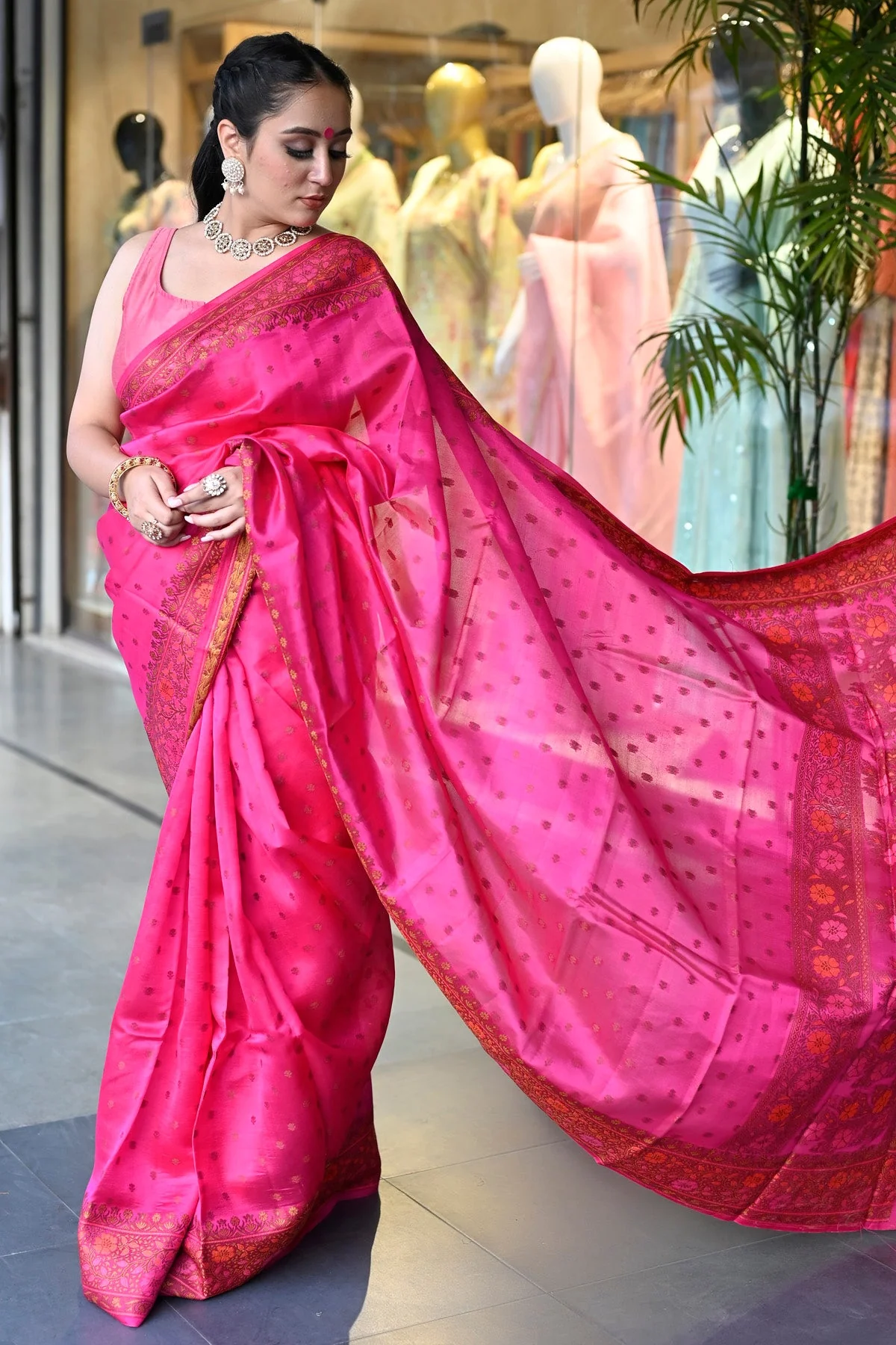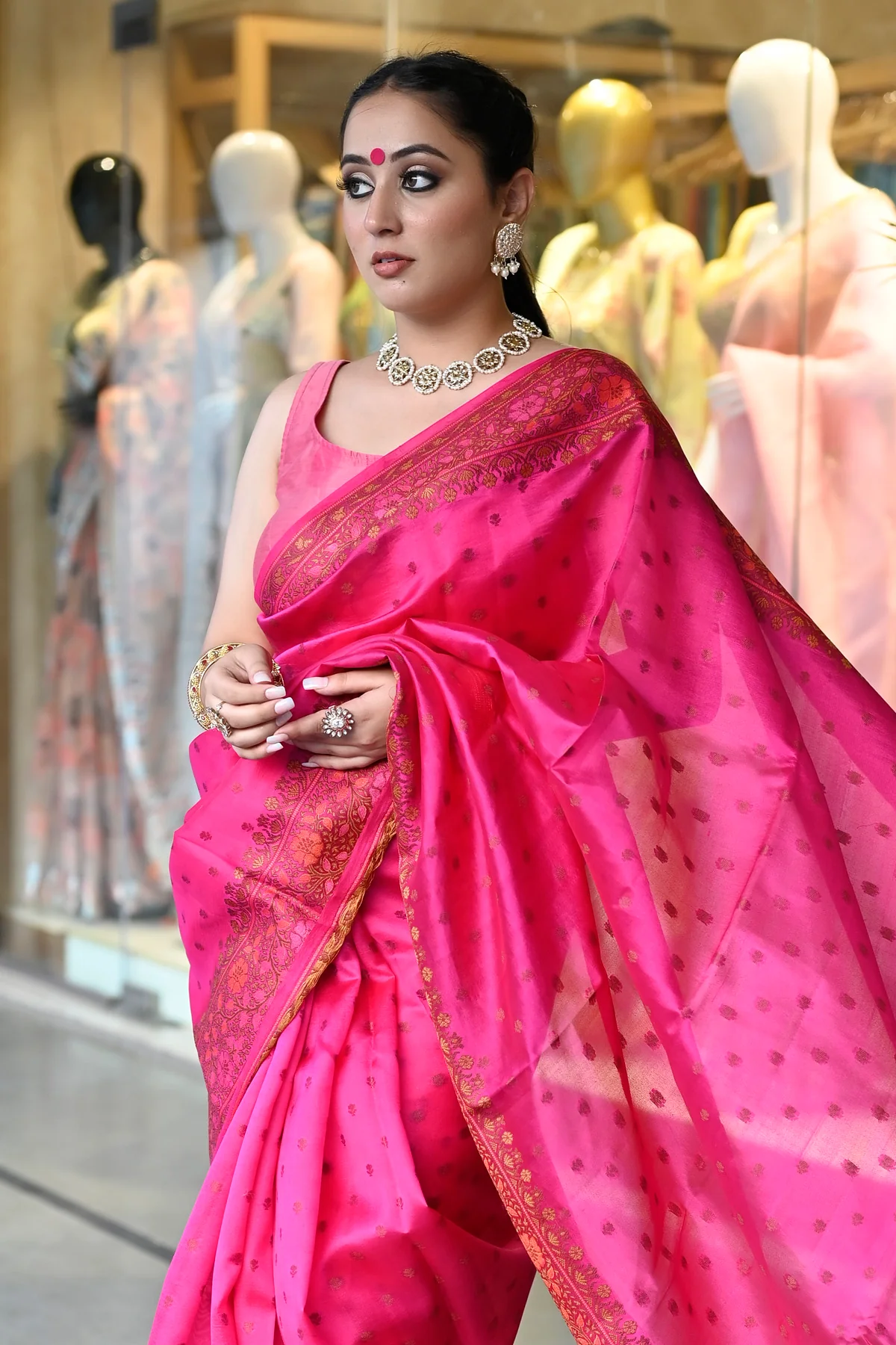 Hot Pink Color Silk Handloom Saree with Heavy Pallu