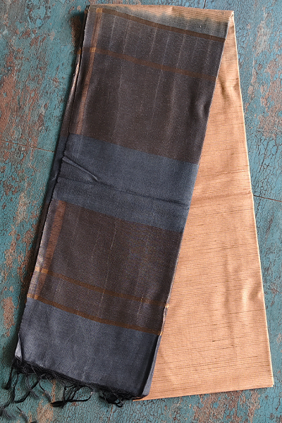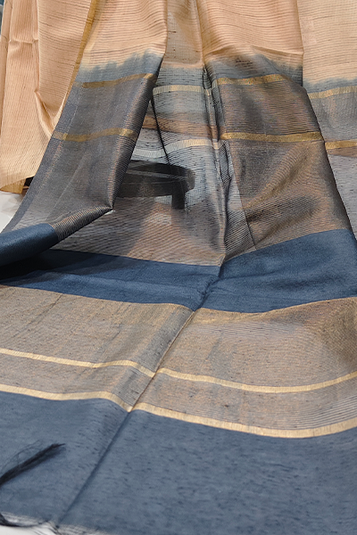 Color: Beige body with slate grey pallu and blouse, golden-beige striped detailing