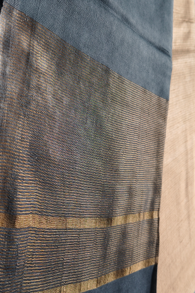 The pallu and blouse offer a striking contrast in deep slate grey, adorned with minimalistic golden and beige stripes