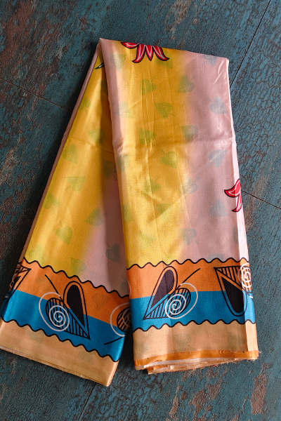 Color: Blend of yellow, cream, blue, green, and multicolor Madhubani-inspired art