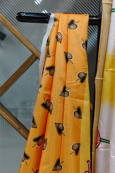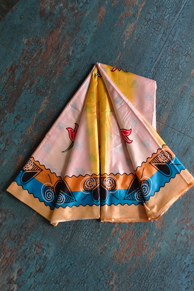 Playful floral motifs across the body with a rich, storytelling pallu in tribal art and a distinctive printed border in earthy tones