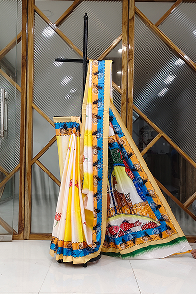 A celebration of folk culture and vivid hues, this multicolor silk-blend saree captures the spirit of tradition and modernity in perfect sync. The saree body features a radiant palette of soft yellows and warm creams with playful motifs and floral accents, while the highlight remains the exquisite pallu—adorned with vibrant Madhubani-style tribal artwork, including elephants, deer, birds, and fish. A blue and mustard dual-toned border runs across the length with stylized spiral and petal designs, adding bold contrast and vibrancy. This saree is for the woman who values heritage while making a contemporary statement.