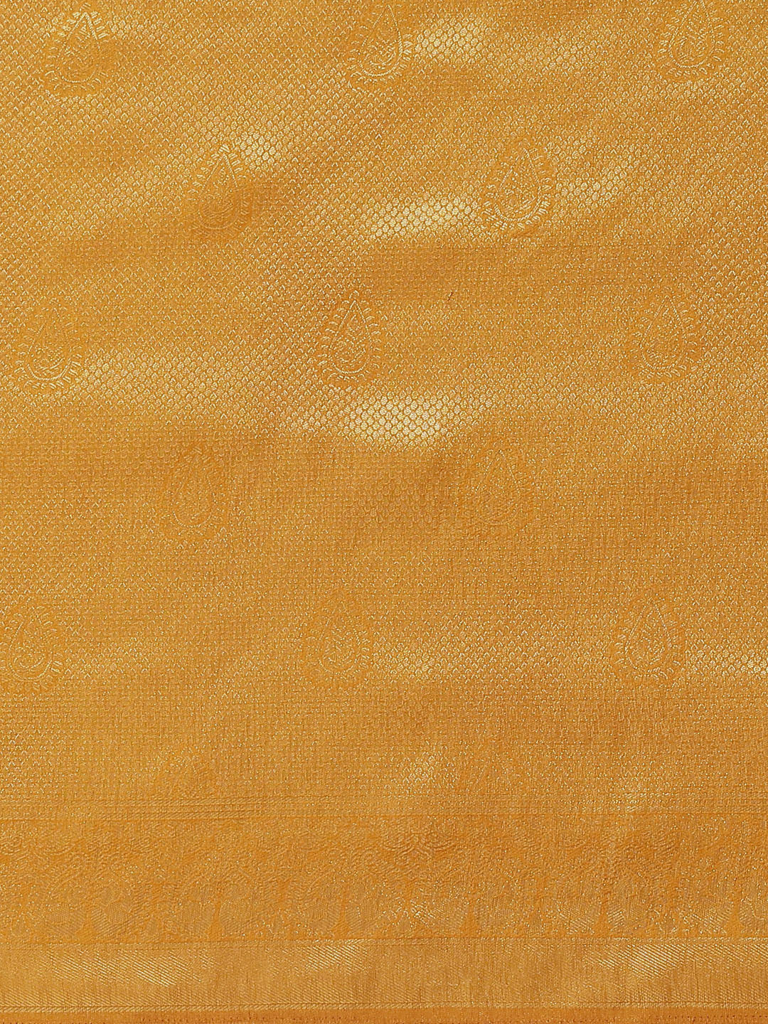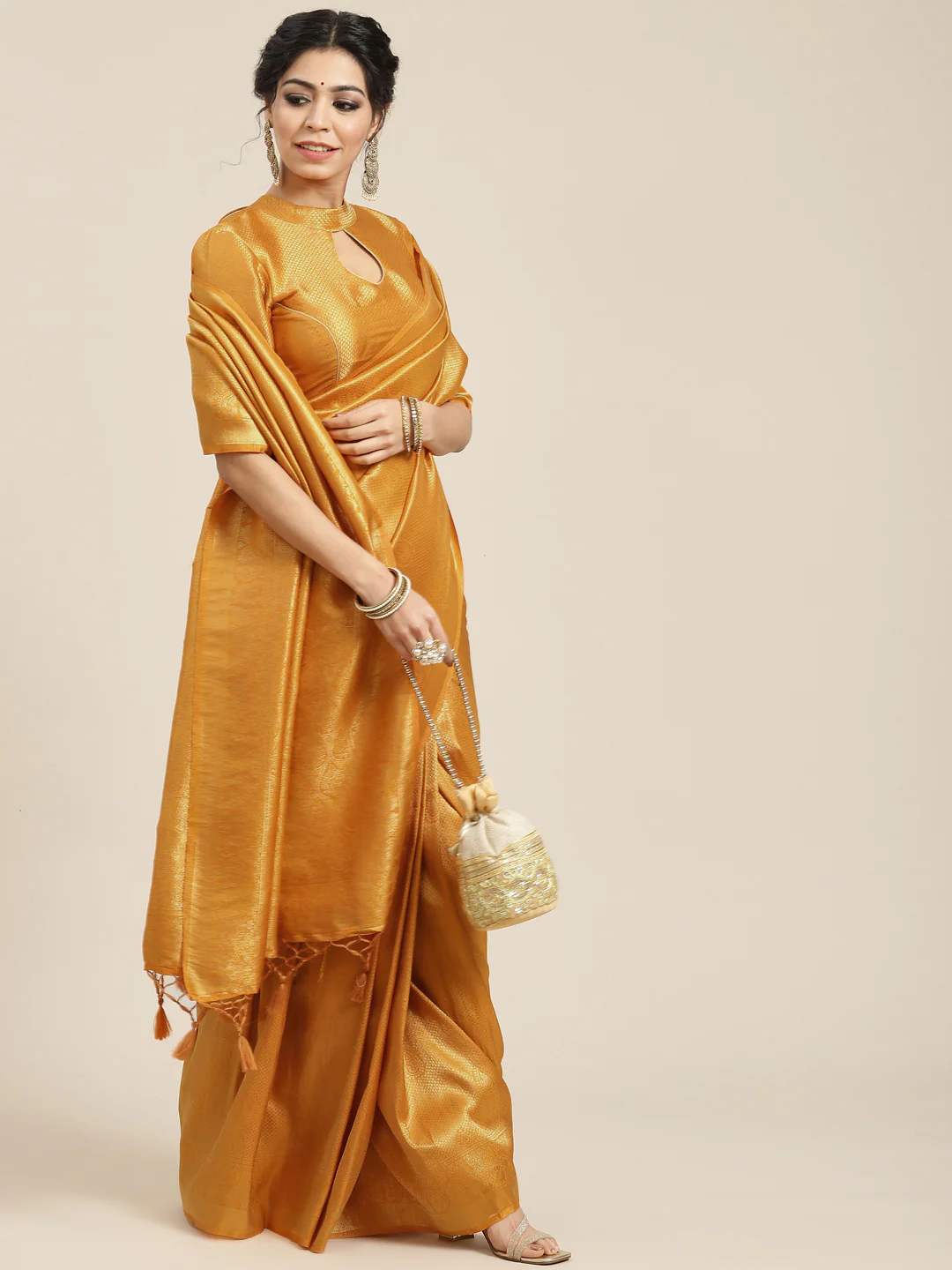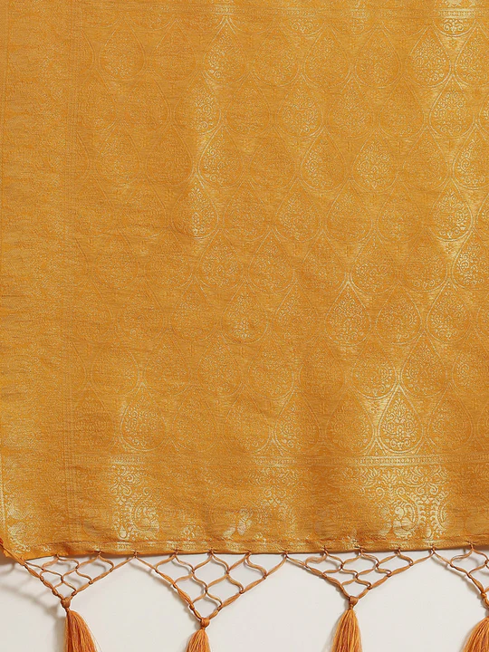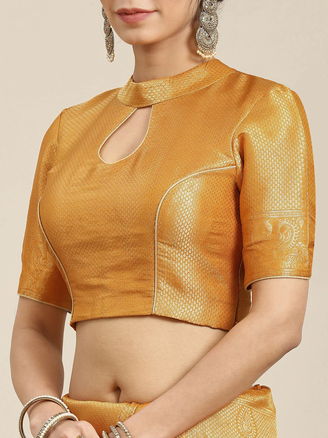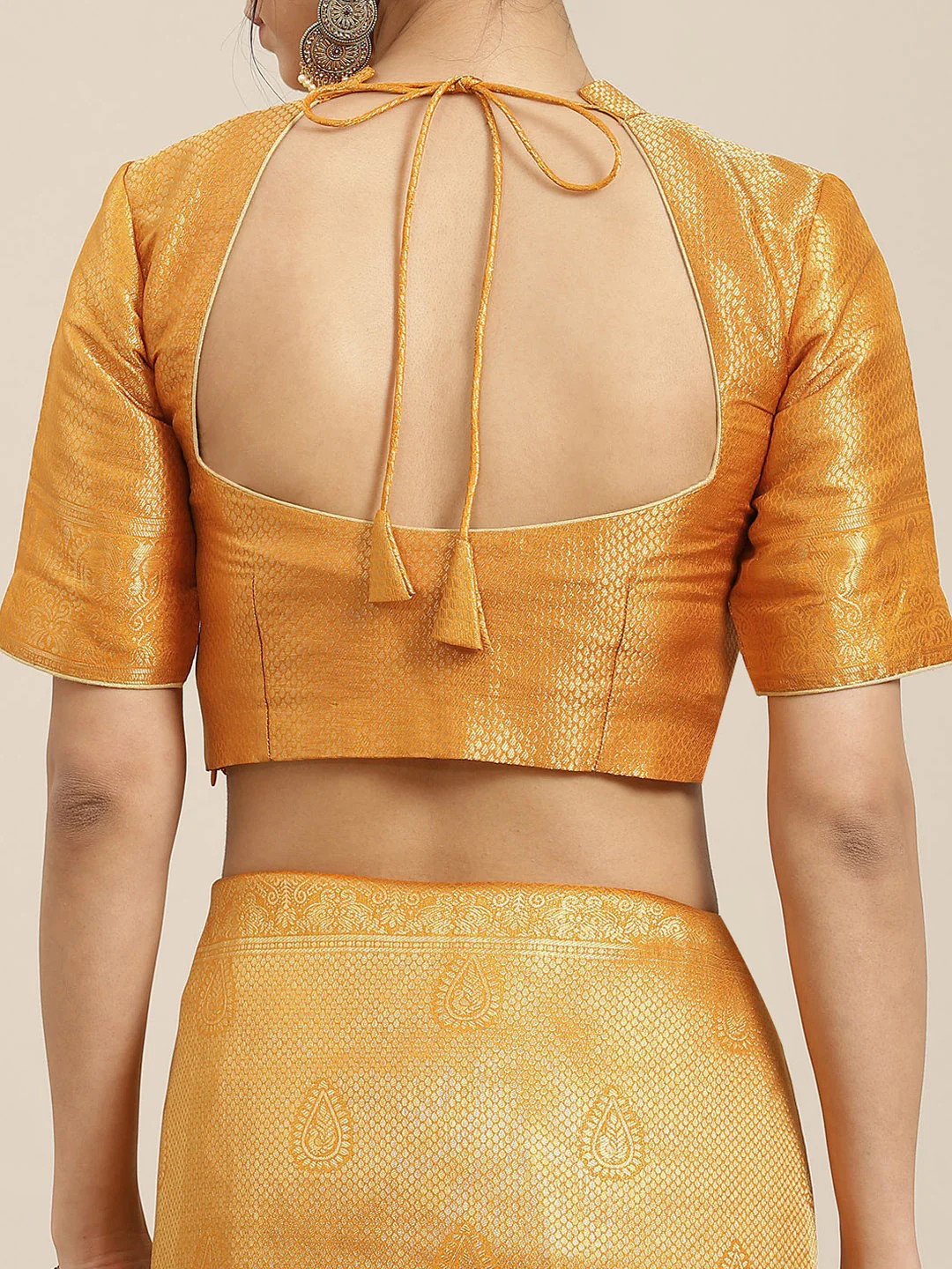 The model is wearing a stitched version of the blouse piece. The saree comes with an unstitched blouse piece.