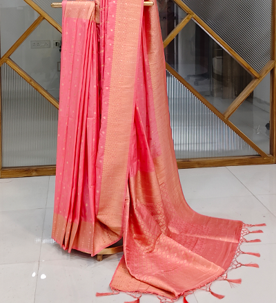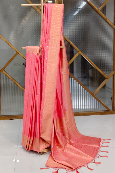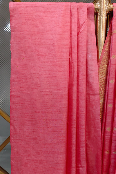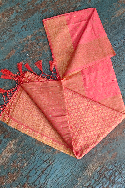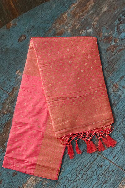 Emanate soft sophistication with this enchanting semi-Katan silk saree in a radiant gulabi (rose pink) shade. Woven with fine golden zari butis scattered across the body, it captures a timeless feminine charm. The border and pallu feature intricate brocade-style weaving in luminous gold, ending in elegant tassels that add a delicate flourish to the drape.