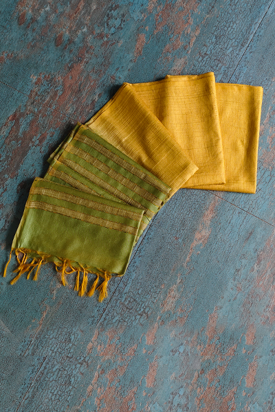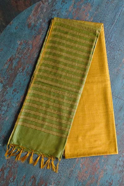 Radiate elegance with this stunning yellow linen saree, a perfect blend of tradition and contemporary charm. Crafted from good quality linen, this saree boasts a vibrant sunflower yellow body that exudes warmth and energy. The highlight is the beautifully contrasting green pallu adorned with green color blouse peice, adding a refreshing twist to the classic silhouette.