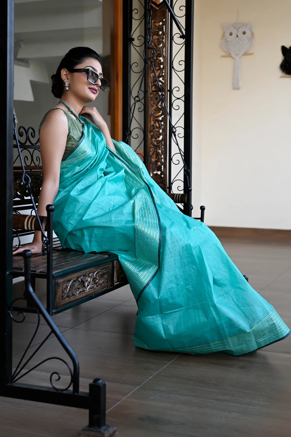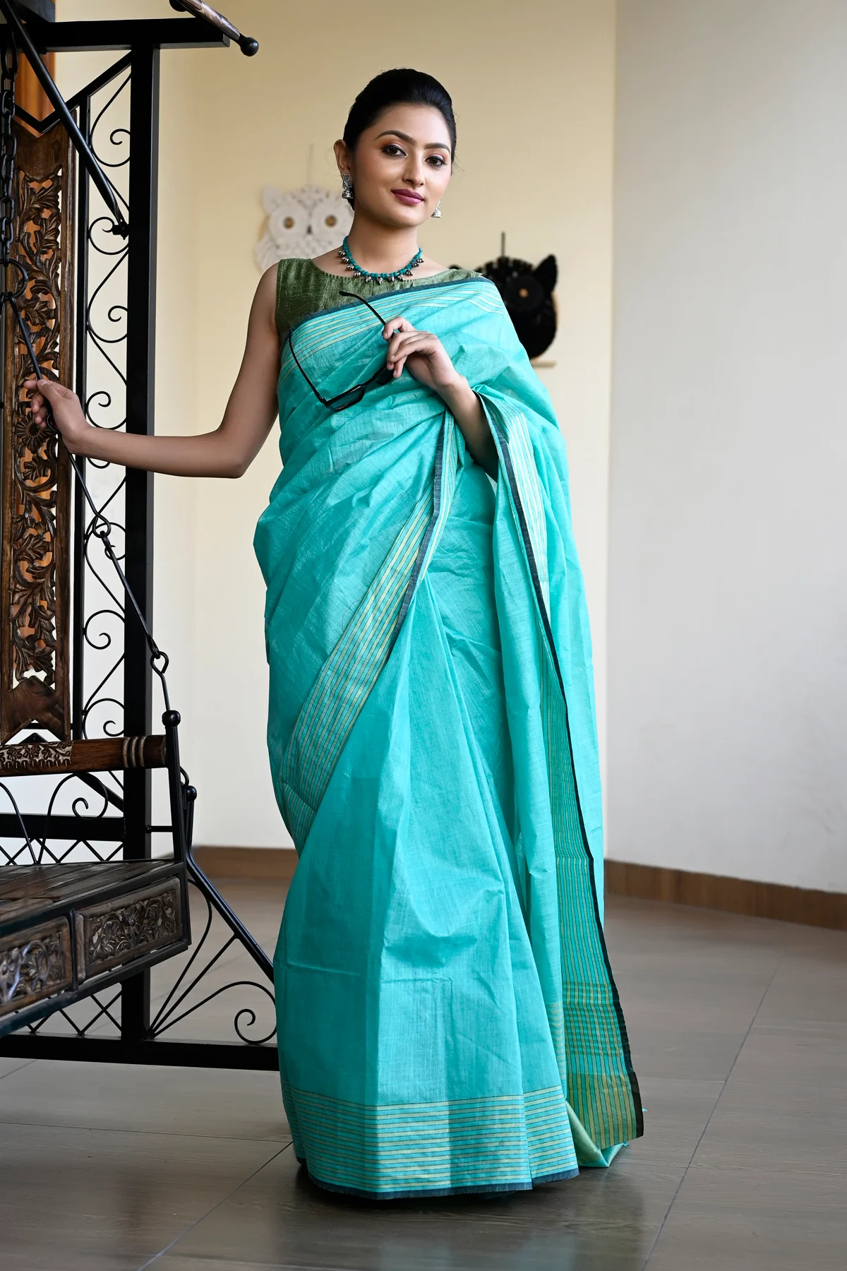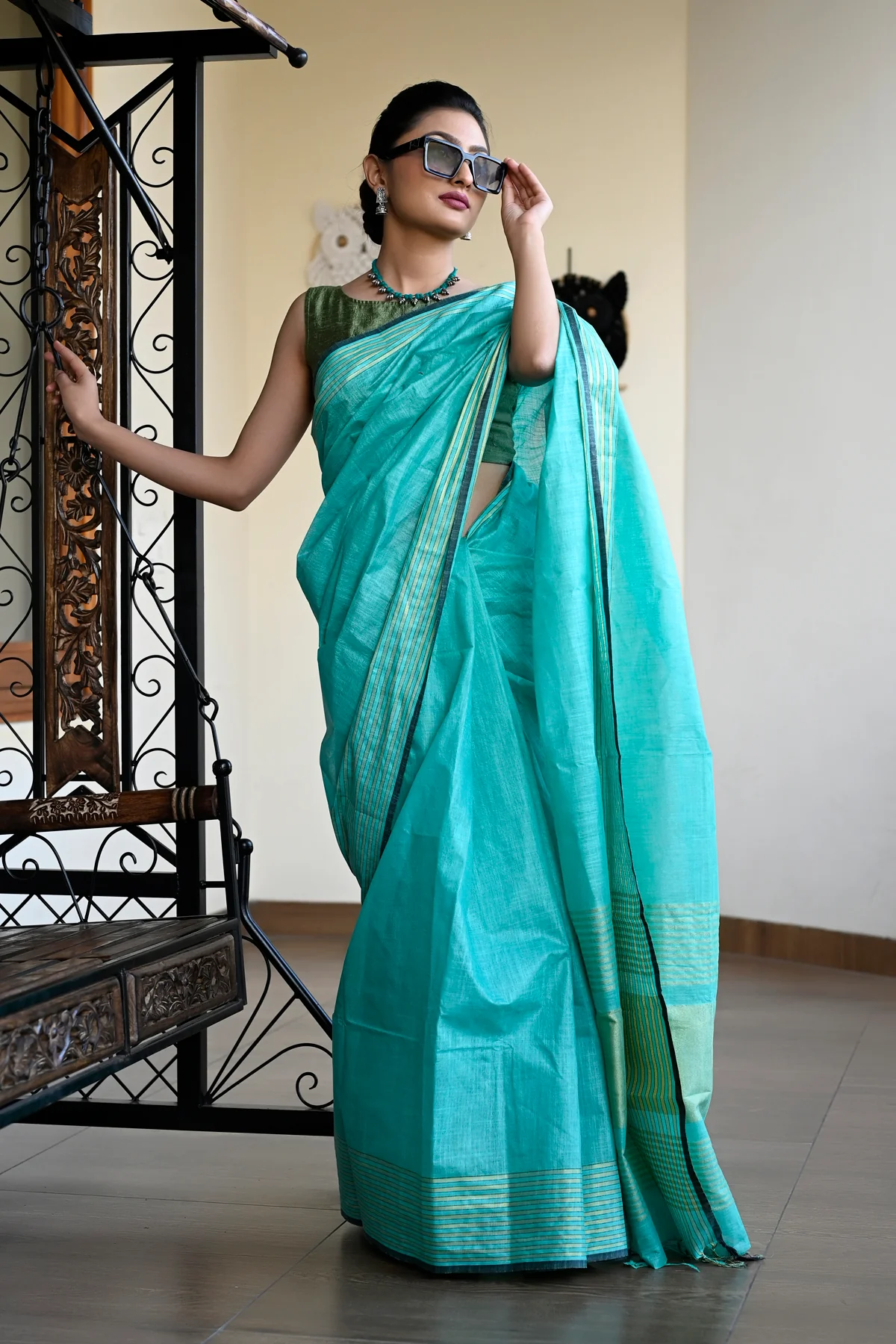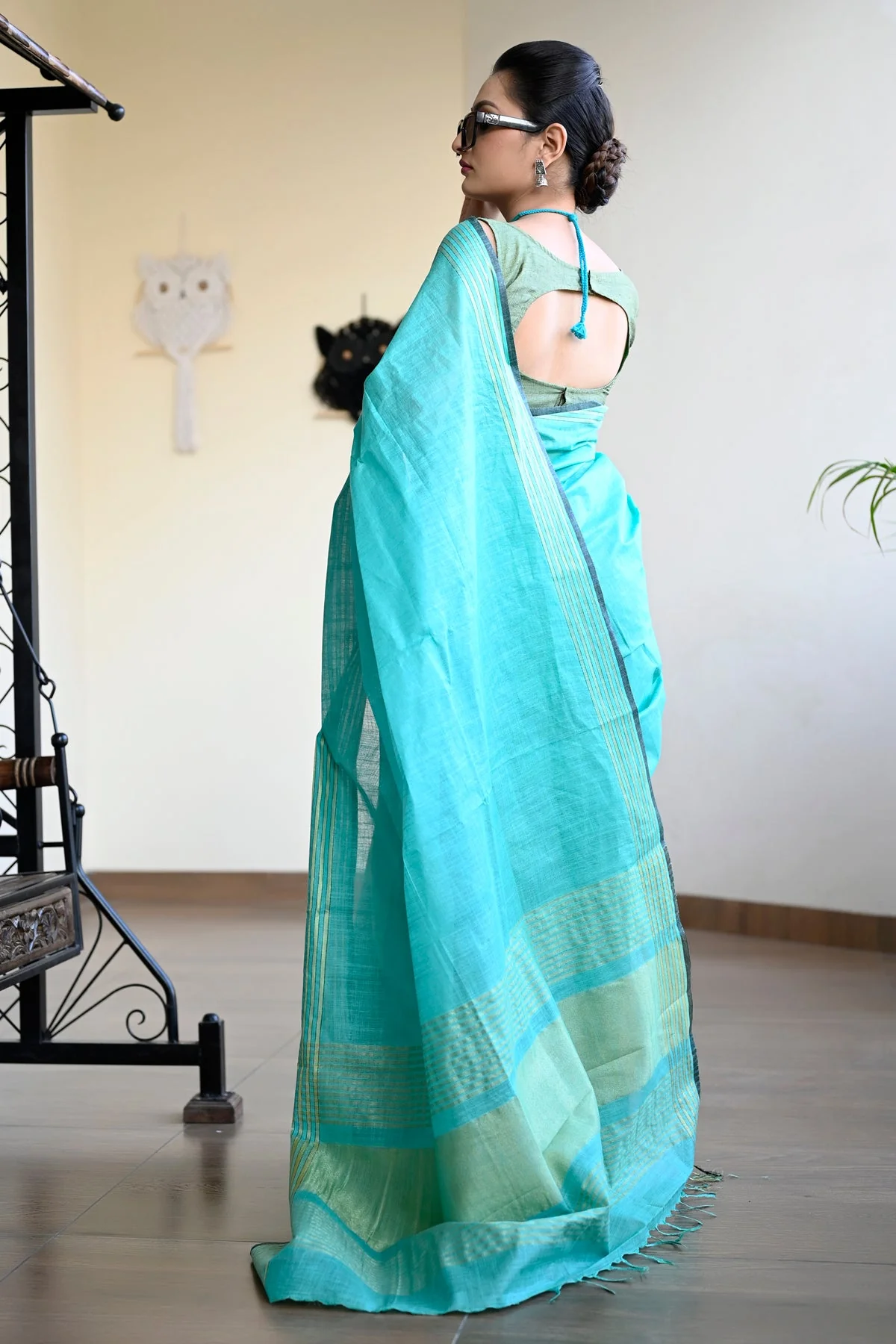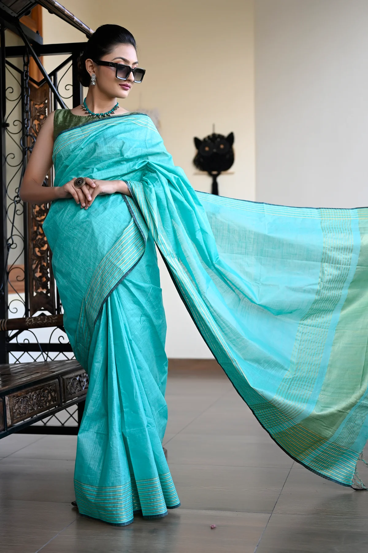 Sea Green Color Pure Cotton Solid Maheshwari Handloom Saree and has a Zari Border. Handloom weaved saree made with threads of Pure fabric. The model is wearing a blouse from our stylist’s collection, actual blouse will be 90-95% similar to this. See the image for a mock-up of what the actual blouse would look like.